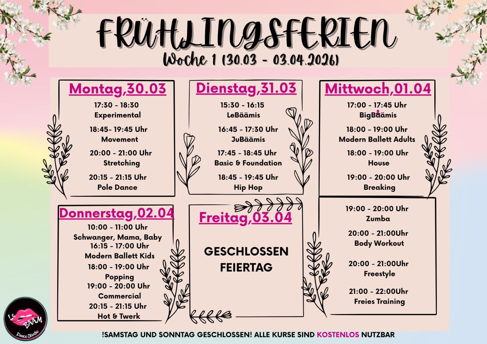 Wir machen nur bedingt Tanzpause. Wir bieten euch ein abwechslungsreiches und spezielles Angebot. Für unsere Le Bääm Kunden ist dies Kostenlos, Besucher und Externe können natürlich auch für einen kleinen Class Beitrag mittanzen.